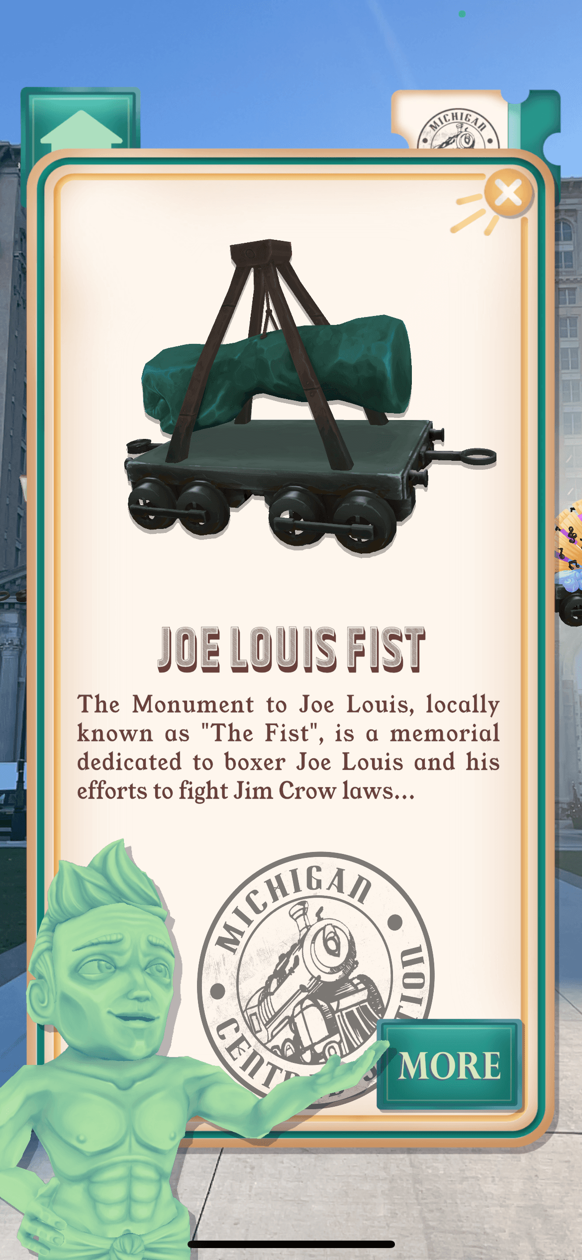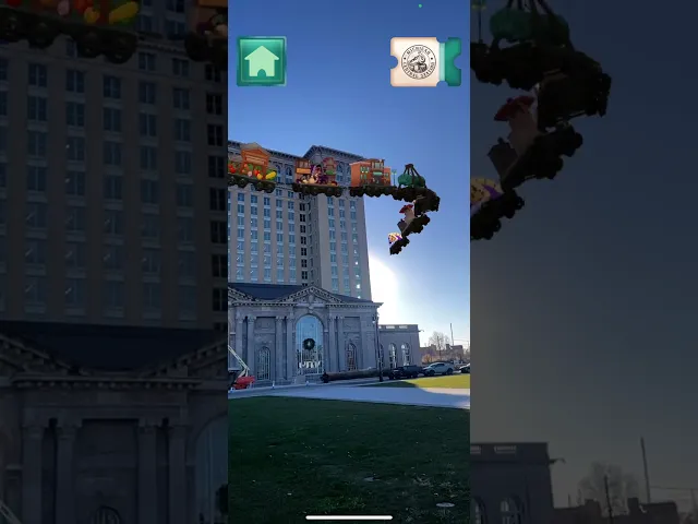 The "History Express", a large-scale train that circles the entirety of Michigan Central Station, digitally covering 640,000 square feet. Each of the train cars represents a different historic neighborhood or thing that makes Detroit iconic.